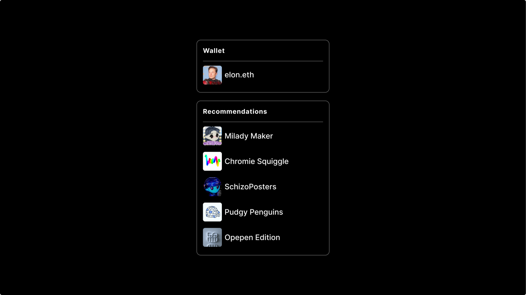 Our recommendation engine enables you to generate curated "you may like" experiences that encourage users to explore new NFTs and collections. By presenting users with NFTs that are likely to pique their interest, you can increase the chances of user interactions and transactions.